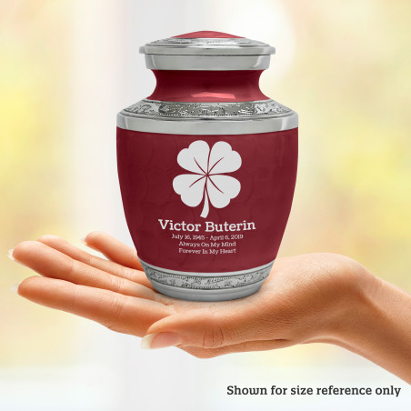 Select 4 Leaf Clover Sharing Urn - Rose Red to create a personal memorial that is a step larger than a keepsake urn but more petite than a full size urn. Bold, attractive colors offer sharp contrast with the engraved text and detailed artwork.