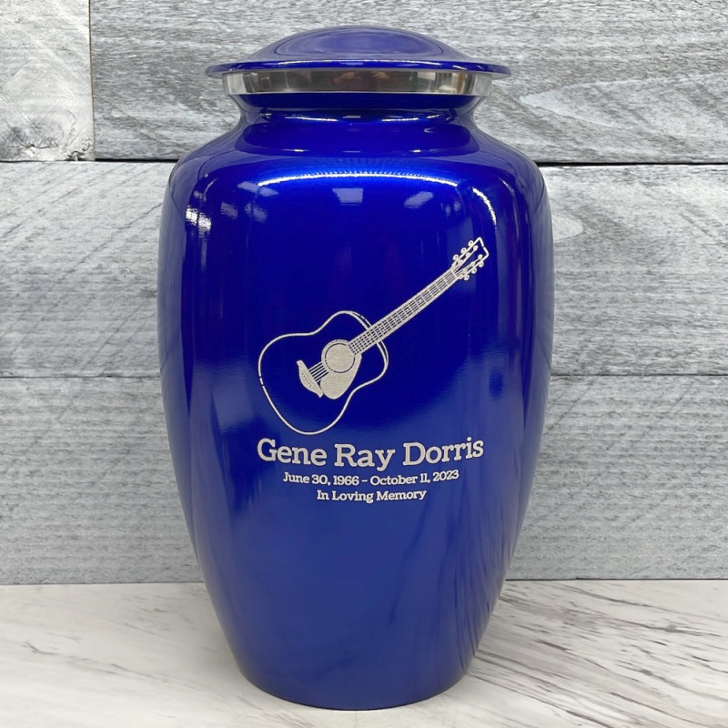 The soul speaks through music. Pay tribute to your loved one's self expression and creative genius with our Acoustic Guitar Urn in Midnight Blue. The front and the back of our urns are available for engraving sentiments, poems, or custom text.