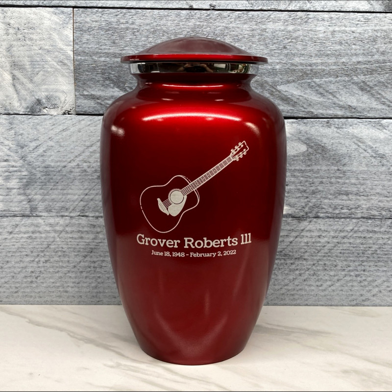 The Ruby Red Acoustic Guitar Cremation Urn is an attractive and fitting memorial for the departed loved one who had a passion for music. The detailed artwork can be combined with optional engraving on the front and back of the urn. Engraving suggestions are available via drop down menus or custom text can be entered to ensure that the custom urn that is created is a treasured memorial for your loved one.