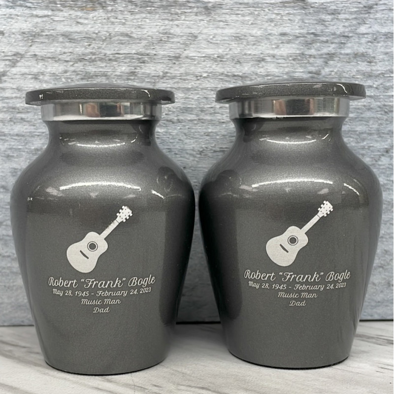 Choose the Gunmetal Acoustic Guitar Keepsake Cremation Urn to celebrate your loved one with a personal memorial engraved with an acoustic guitar. Customize the urn with special engraving for each family member or close friend, creating memorials for each to hold close.