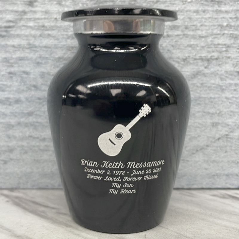 Choose a Acoustic Guitar Keepsake Urn to create an intimate and personal memorial for family members or close friends. Bold, attractive colors offer sharp contrast with the engraved text and artwork.