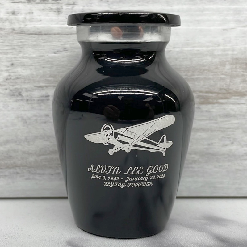 Airplane II Keepsake Urn - Midnight Blue Airplane II Keepsake Urn - Gunmetal Gray Airplane II Keepsake Urn - Purple Luster Airplane II Keepsake Urn - Shamrock Green Airplane II Keepsake Urn - Ruby RedSizes
