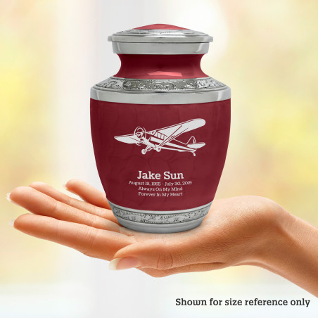 Select Airplane II Sharing Urn - Rose Red to create a personal memorial that is a step larger than a keepsake urn but more petite than a full size urn. Bold, attractive colors offer sharp contrast with the engraved text and detailed artwork.