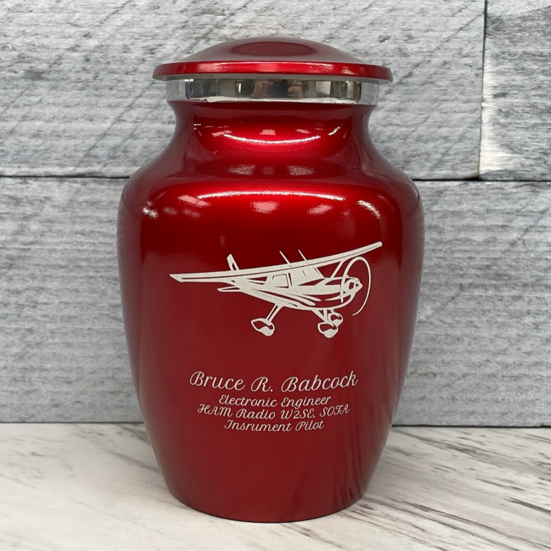 Remember your loved one and their passion for flight and airplanes with the Midnight Blue Airplane Sharing Cremation urn. It's a great value that allows everyone in the family to have a memorial of their own engraved with an small personal aircraft. With optional engraving front and back it can be made unique to your loved one. A threaded lid and felt base ensure it securely closes and protects display surfaces.
