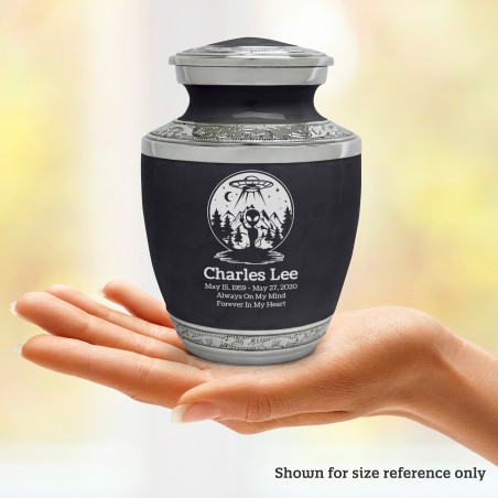 Select Alien UFO Sharing Urn - Ebony Black to create a personal memorial that is a step larger than a keepsake urn but more petite than a full size urn. Bold, attractive colors offer sharp contrast with the engraved text and detailed artwork.
