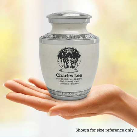 Select Alien UFO Sharing Urn - Radiant White to create a personal memorial that is a step larger than a keepsake urn but more petite than a full size urn. Bold, attractive colors offer sharp contrast with the engraved text and detailed artwork.