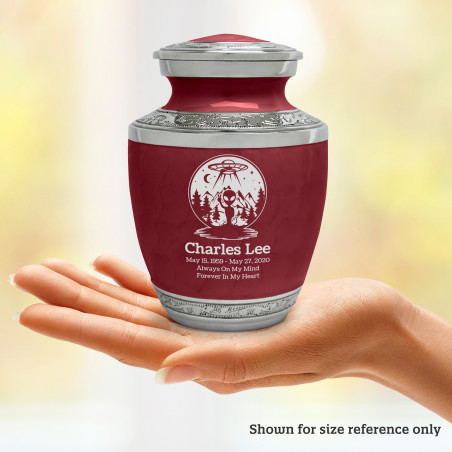 Select Alien UFO Sharing Urn - Rose Red to create a personal memorial that is a step larger than a keepsake urn but more petite than a full size urn. Bold, attractive colors offer sharp contrast with the engraved text and detailed artwork.