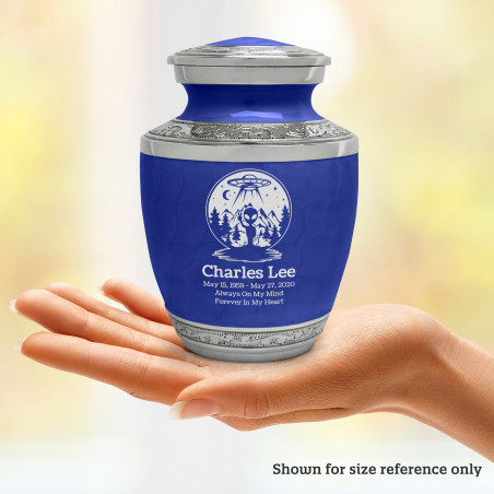 Select Alien UFO Sharing Urn - Royal Blue to create a personal memorial that is a step larger than a keepsake urn but more petite than a full size urn. Bold, attractive colors offer sharp contrast with the engraved text and detailed artwork.