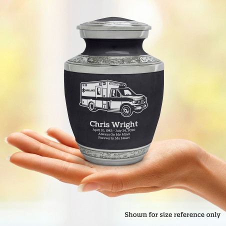 Select Ambulance Sharing Urn - Ebony Black to create a personal memorial that is a step larger than a keepsake urn but more petite than a full size urn. Bold, attractive colors offer sharp contrast with the engraved text and detailed artwork.