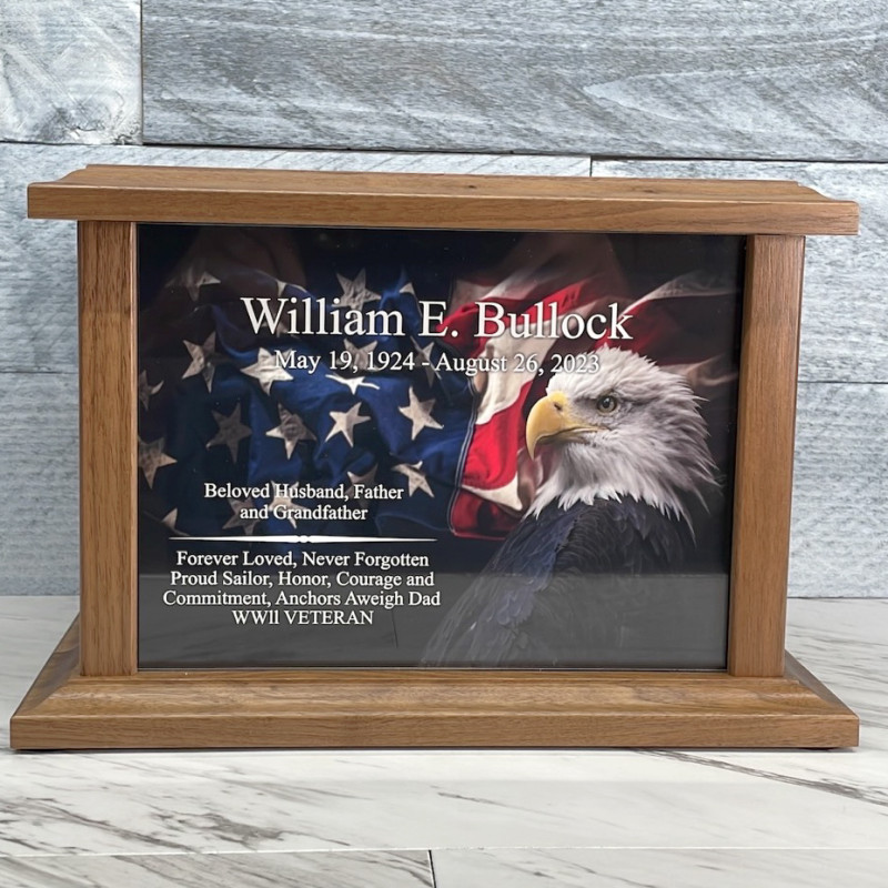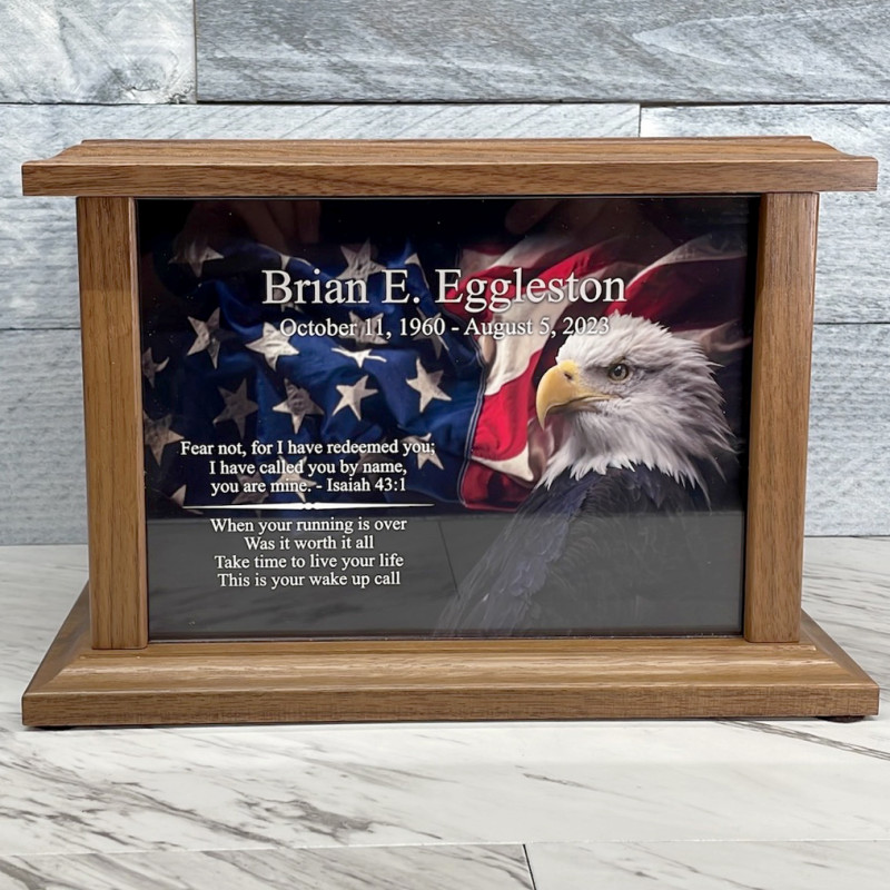 Combining two of the greatest symbols of the United States, the American Flag Bald Eagle Urn is a featured member the Green Meadow Memorials Prestige Line of high end premium urns. Constructed of solid walnut and built in the USA by domestic artisans, this is an urn that any Patriot would be proud of. The full color artwork is printed with archival quality ink, and protected with an acrylic layer so that the custom sentiments or poems printed on it will last generations.