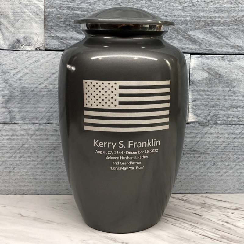 This American Flag Cremation Urn proudly displays the beautiful flag of the United States on our popular Gunmetal Gray Urn, and shows engraving in incredible detail. With multiple custom lines of text available via the Green Meadow engraving wizard, it will carry the right words for a long lasting memorial.
