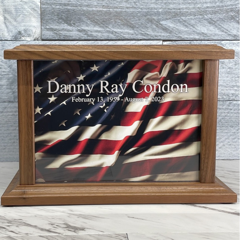 An American flag, proudly raised high and snapping in the breeze is a beautiful site to see. This Prestige American Flag Urn is made from solid walnut by skilled craftsmen right here in the USA, and captures that image into a stunning memorial. The flag print is protected by a sheet of clear acrylic and printed with archival quality ink so that the image will last for generations.