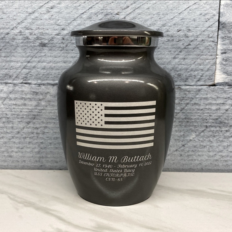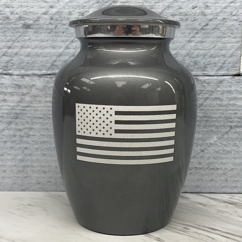 The Gunmetal Gray American Flag Sharing Cremation Urn memorializes your patriot with a detailed American Flag. An outstanding value that allows everyone in the family to have a memorial of their own, optional engraving front and back there are many ways to make the urn unique to your loved one. A threaded lid and felt base ensure it securely closes and protects display surfaces.