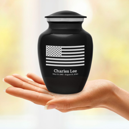 Select a American Flag Sharing Urn to create a personal memorial that is a step larger than a keepsake urn but more petite than a full size urn. Bold, attractive colors offer sharp contrast with the engraved text and detailed artwork.