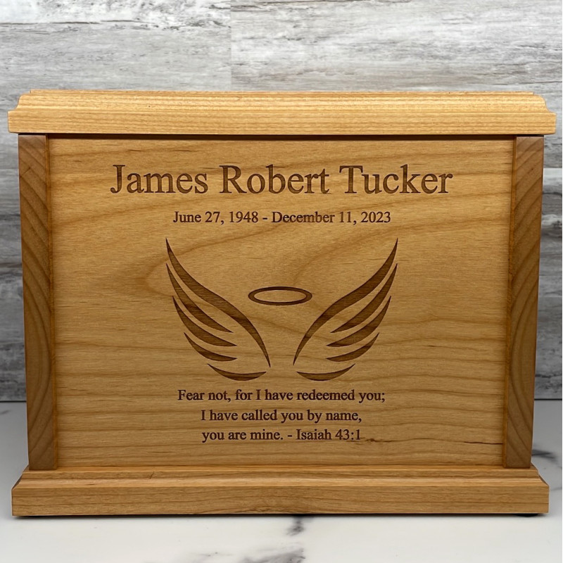 Our Signature Alder Urns are custom made in the USA and are exclusively sold by Green Meadow Memorials. Artwork and text engravings stand out beautifully against the solid alder's fine detailing in the grain of the wood. Names, dates, verses, and poem may be engraved on the front and back of our products.
