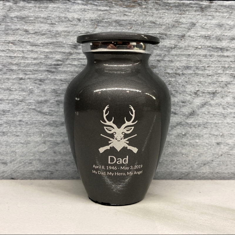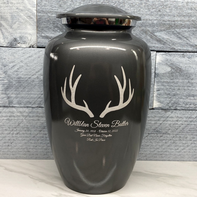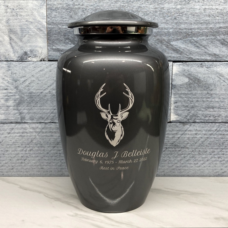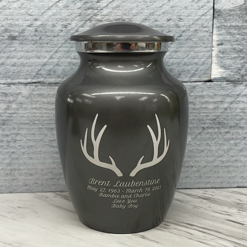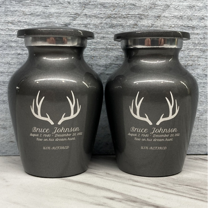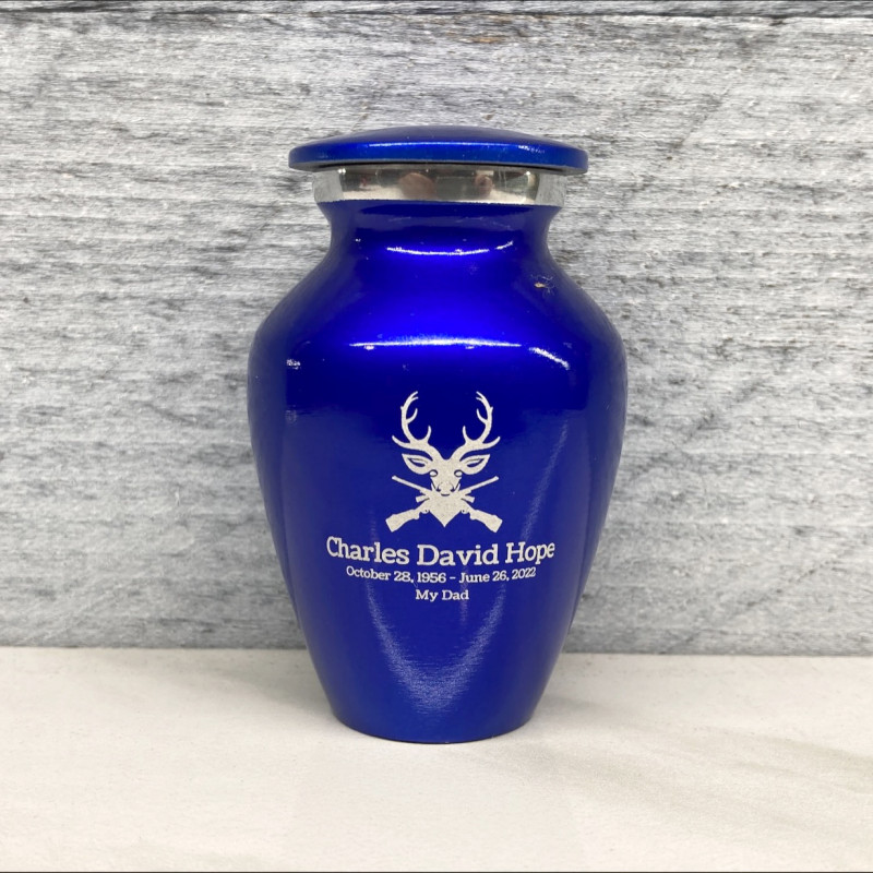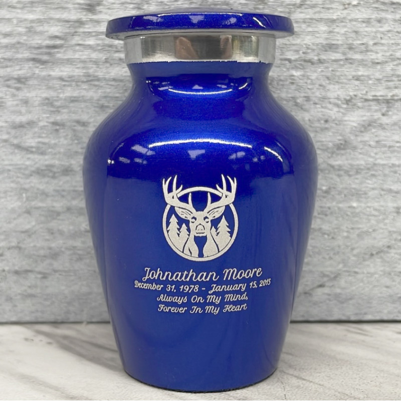 Remember the deer and buck hunting enthusiasm of your loved one with the Midnight Blue Antlers Sharing Cremation urn. It's an outstanding value that allows everyone in the family to have a memorial of their own engraved with an Marine Corps Emblem. With optional engraving front and back it can be made unique to your loved one. A threaded lid and felt base ensure it securely closes and protects display surfaces.