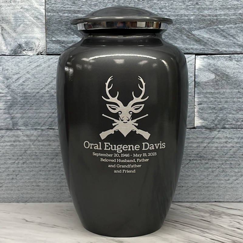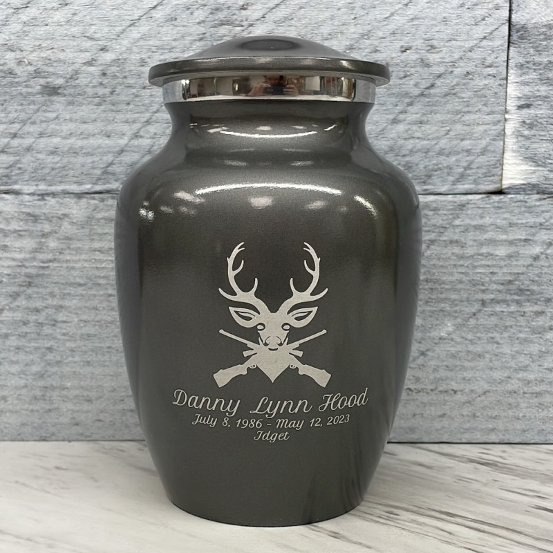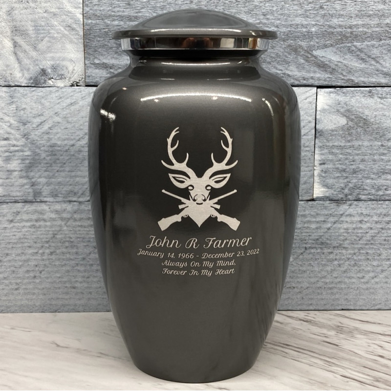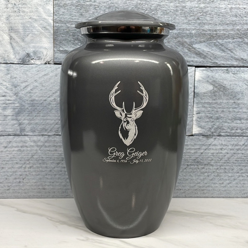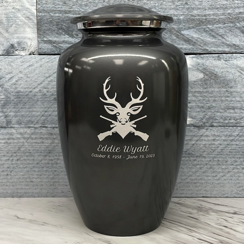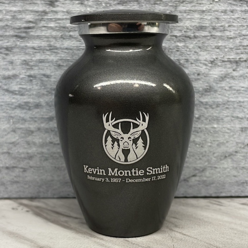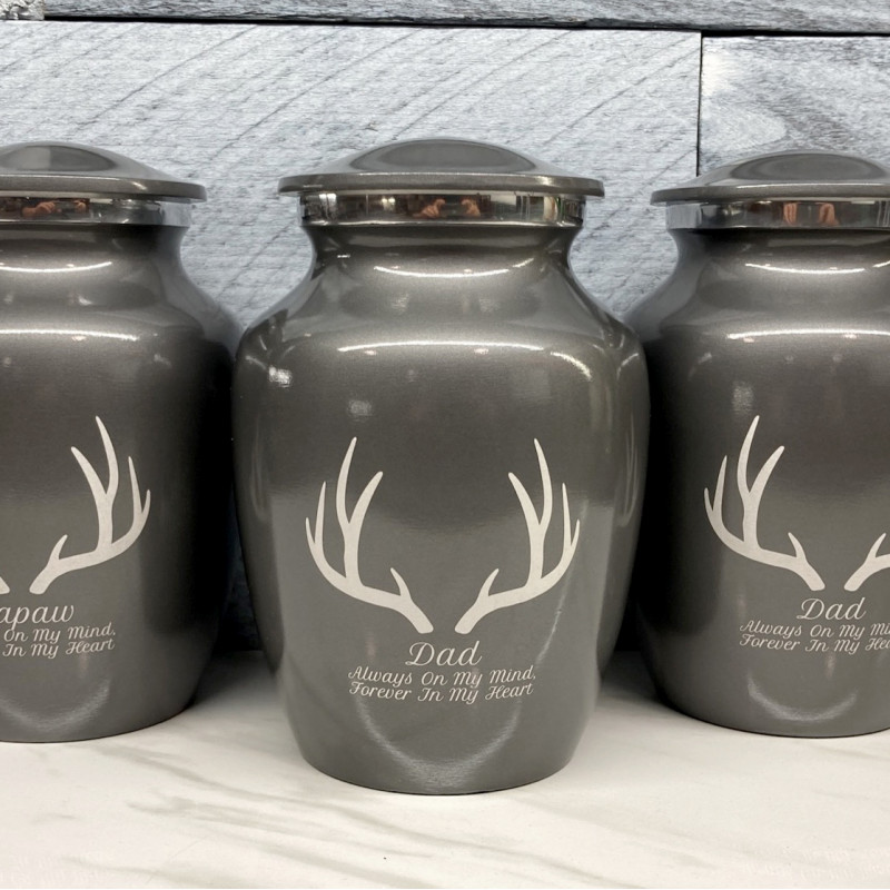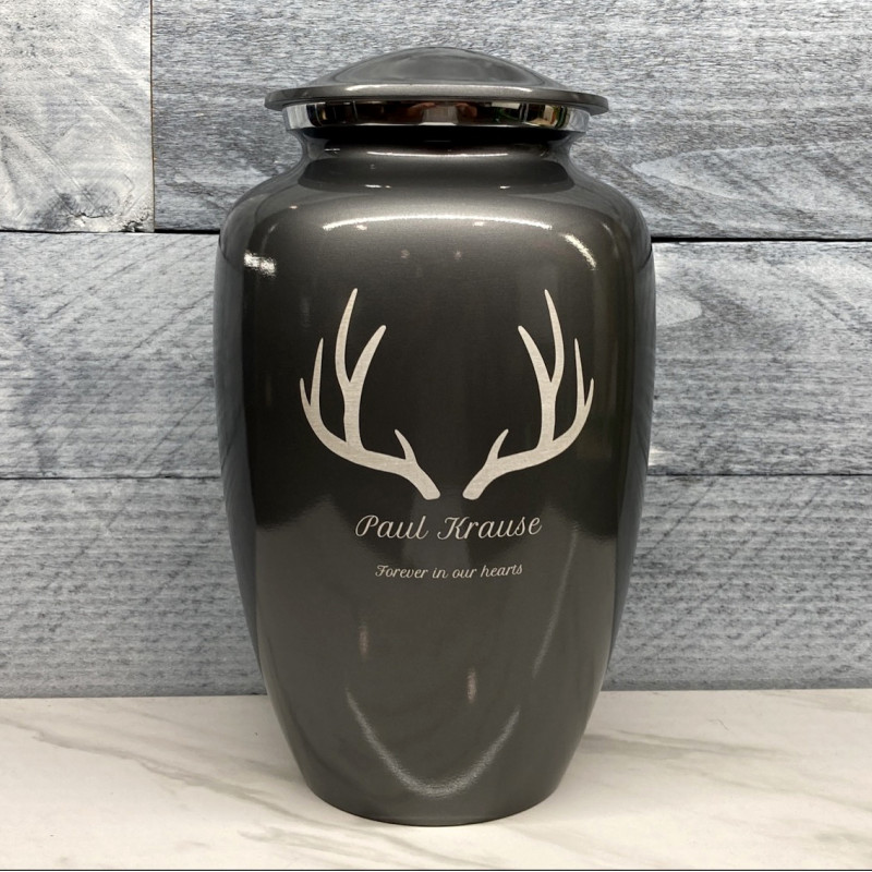 Remember the deer and buck hunting enthusiasm of your loved one with the Midnight Blue Antlers Sharing Cremation urn. It's an outstanding value that allows everyone in the family to have a memorial of their own engraved with an Marine Corps Emblem. With optional engraving front and back it can be made unique to your loved one. A threaded lid and felt base ensure it securely closes and protects display surfaces.