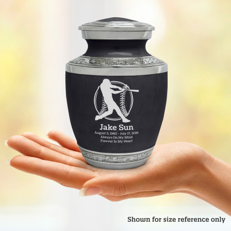 Select Baseball Sharing Urn - Ebony Black to create a personal memorial that is a step larger than a keepsake urn but more petite than a full size urn. Bold, attractive colors offer sharp contrast with the engraved text and detailed artwork.