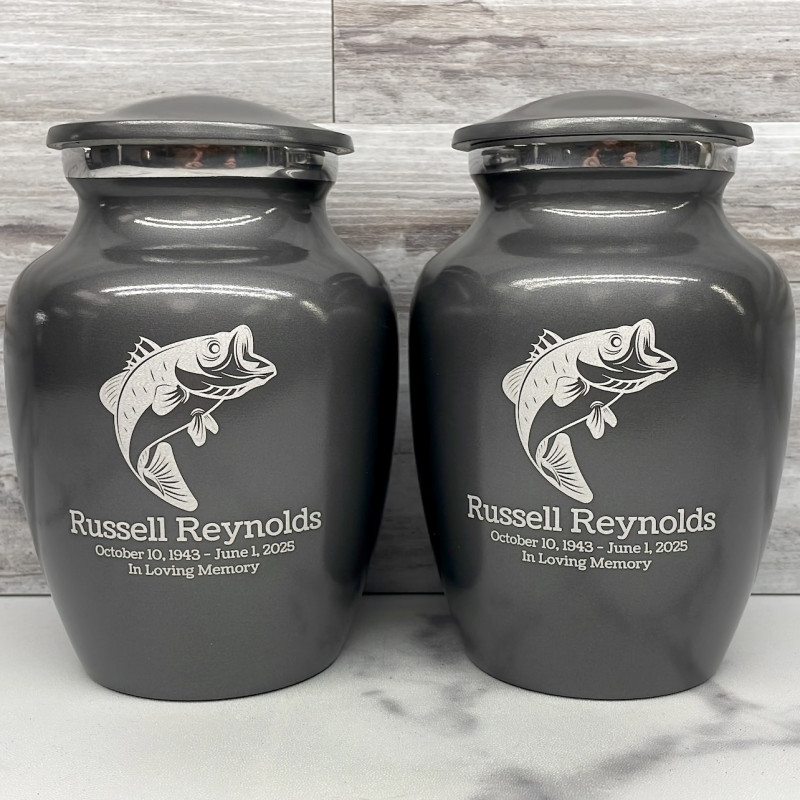 The Gunmetal Gray Bass Fishing Sharing Cremation Urn celebrates the thrill of chasing bass. It's an outstanding value that allows everyone in the family to have a memorial of their own. Optional engraving front and back there are many ways to make the urn unique to your loved one. A threaded lid and felt base ensure it securely closes and protects display surfaces.