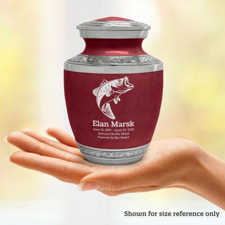 Select Bass Fishing Sharing Urn - Rose Red to create a personal memorial that is a step larger than a keepsake urn but more petite than a full size urn. Bold, attractive colors offer sharp contrast with the engraved text and detailed artwork.