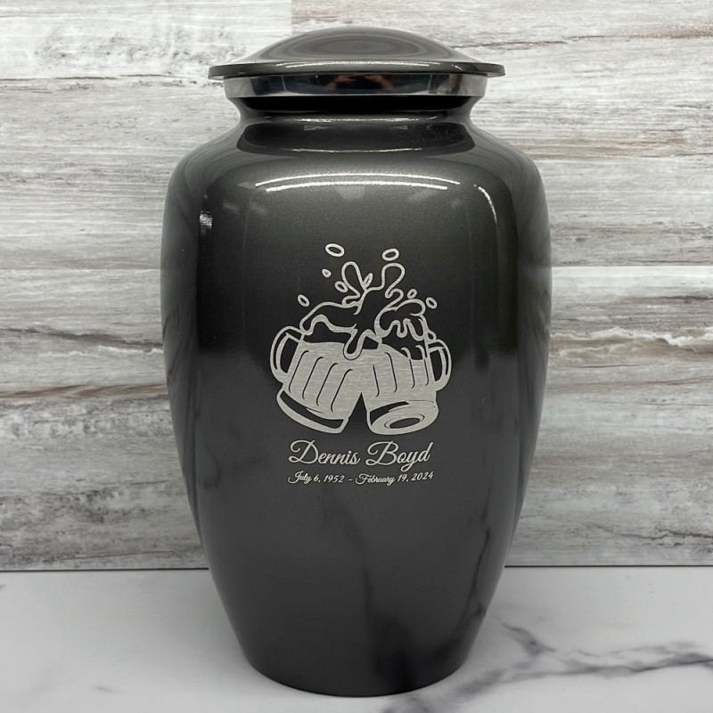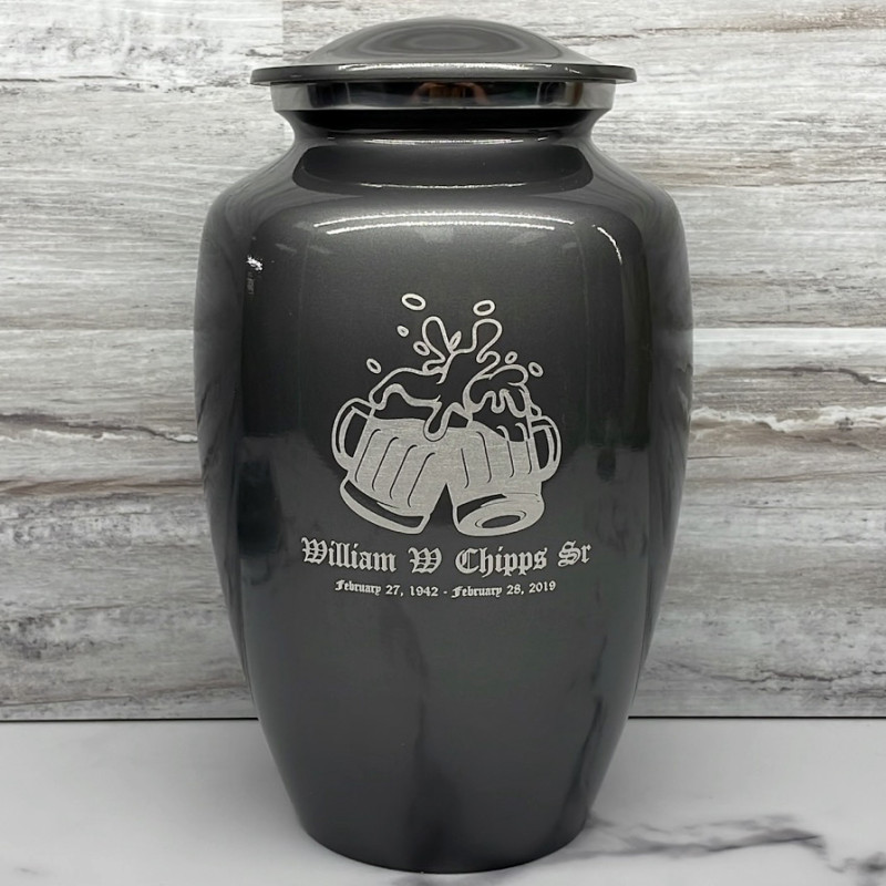 Memorialize the good times with the Gunmetal Gray Beer Cremation Urn. The worlds best beverage can be appreciated in many different ways and flavors, and this memorial can be made completely unique by adding custom engraving. Engraving options allow for both the front and back to be customized and a velour bag is also available for safekeeping the finish during transit or storage.