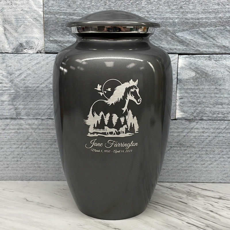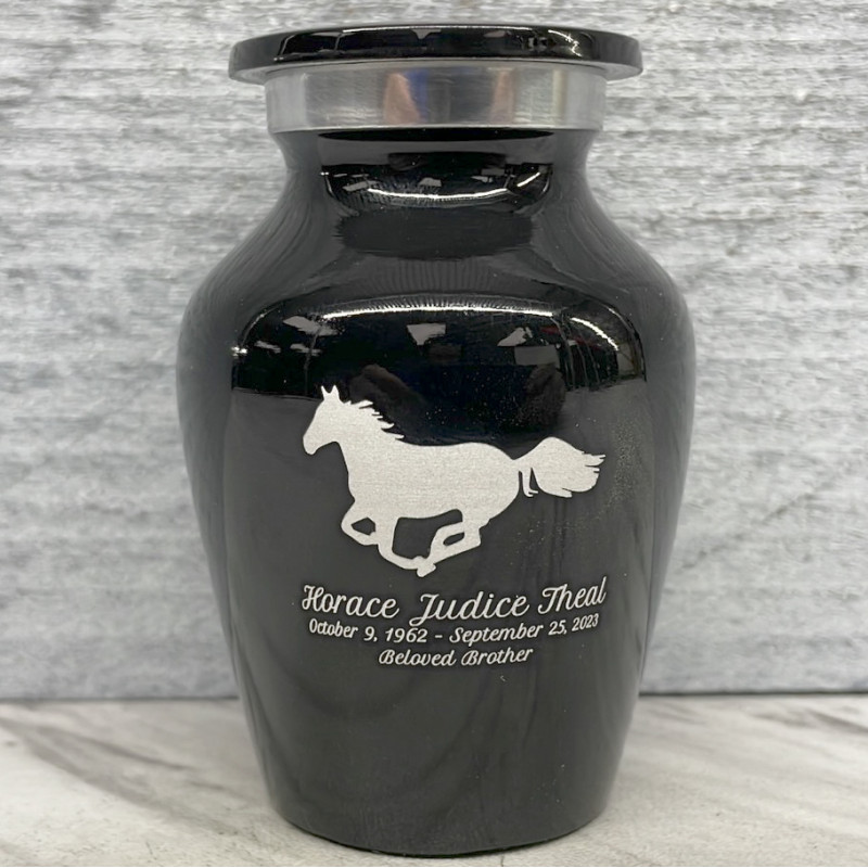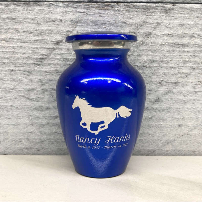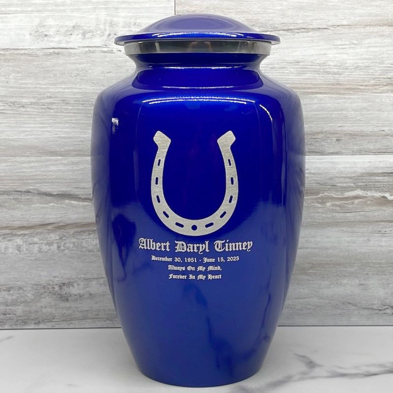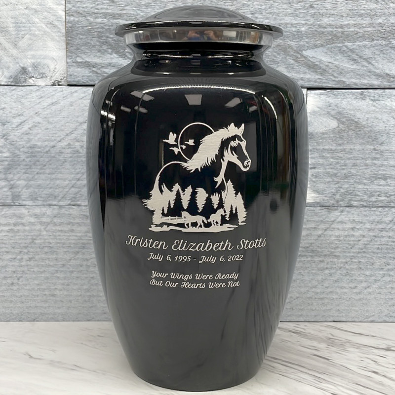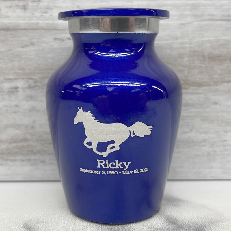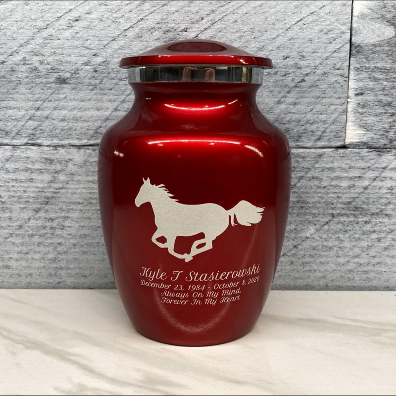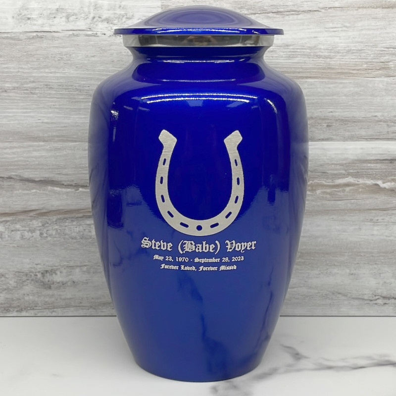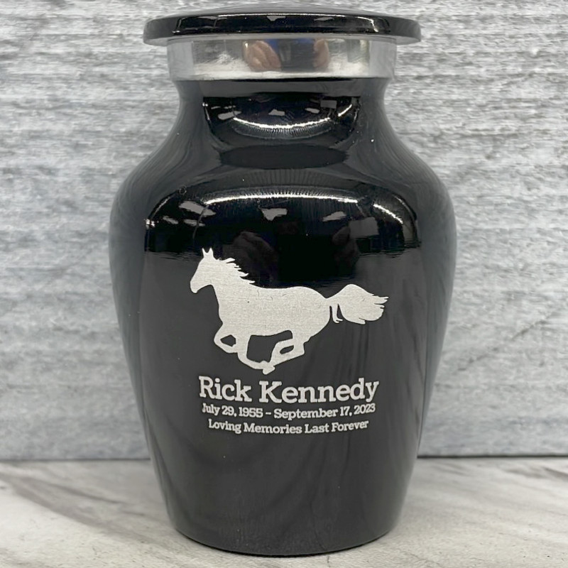 Choose a Bronco Cremation Urn to create a beautiful memorial that is sized to hold the entire remains of any adult. Bold, attractive colors offer sharp contrast with the engraved text and detailed artwork.