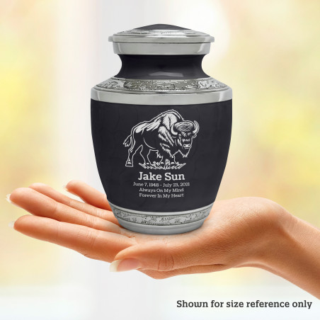 Select Buffalo Sharing Urn - Ebony Black to create a personal memorial that is a step larger than a keepsake urn but more petite than a full size urn. Bold, attractive colors offer sharp contrast with the engraved text and detailed artwork.