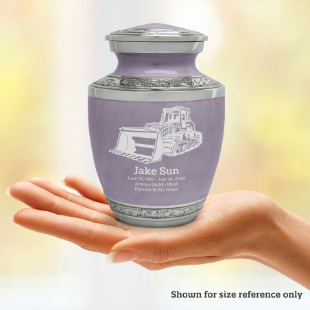 Select Bulldozer Sharing Urn - Regal Purple to create a personal memorial that is a step larger than a keepsake urn but more petite than a full size urn. Bold, attractive colors offer sharp contrast with the engraved text and detailed artwork.