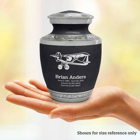 Select Bush Plane Sharing Urn - Ebony Black to create a personal memorial that is a step larger than a keepsake urn but more petite than a full size urn. Bold, attractive colors offer sharp contrast with the engraved text and detailed artwork.
