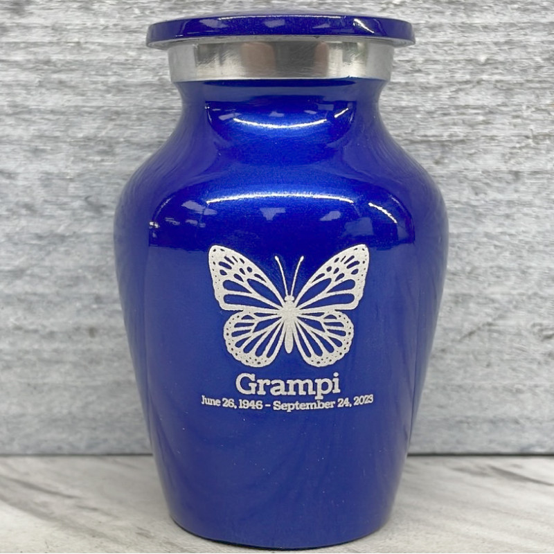 Choose the Midnight Blue Butterfly Keepsake Cremation Urn to create a beautiful personal memorial. The brilliant blue color, detailed butterfly artwork and optional engraving ensure any family member or close friend can have a memorial to call their own.
