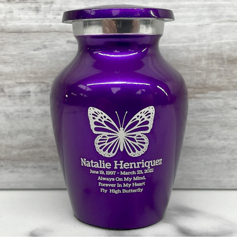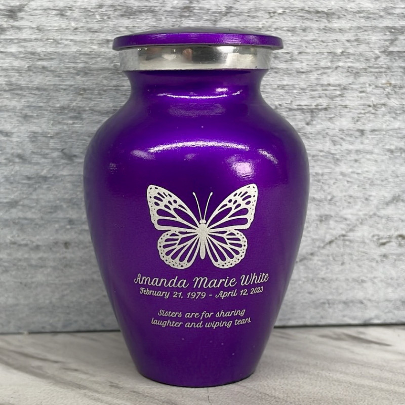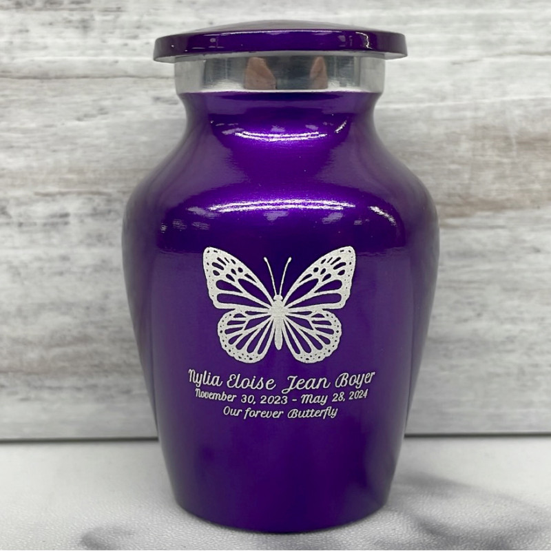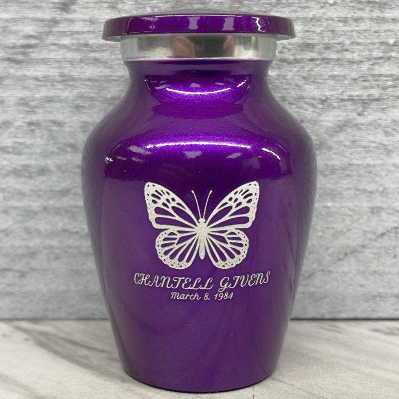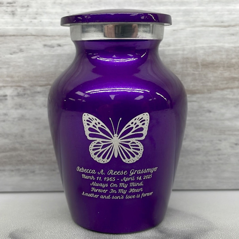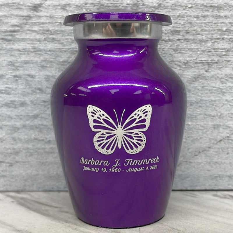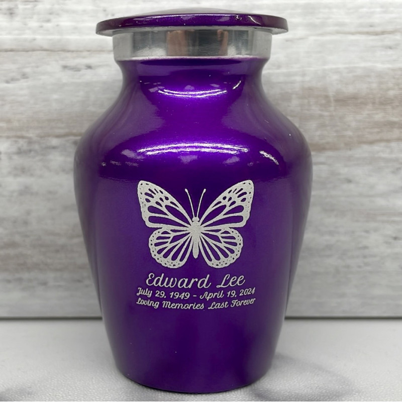 The Purple Luster Butterfly Keepsake Cremation Urn is a beautiful way to memorialize your beloved who appreciated butterflies. Optional engraving that includes names, dates and up to three sentiment lines allows for this personal urn to become completely customized for you, your family or your beloved close friends.