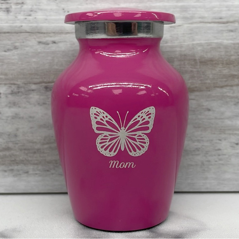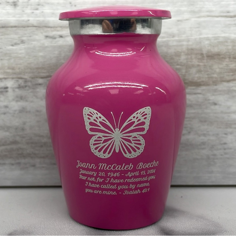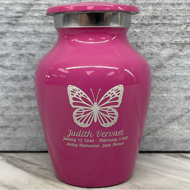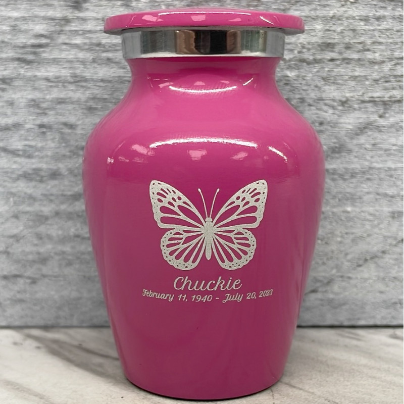 Choose a Butterfly Keepsake Urn to create an intimate and personal memorial for family members or close friends. Bold, attractive colors offer sharp contrast with the engraved text and artwork.