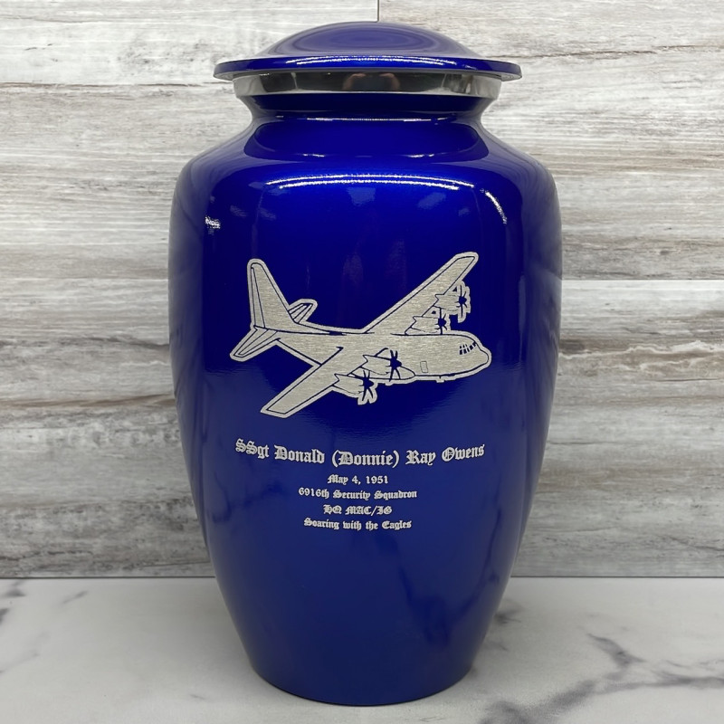 Choose a C130 Plane Cremation Urn to create a beautiful memorial that is sized to hold the entire remains of any adult. Bold, attractive colors offer sharp contrast with the engraved text and detailed artwork.