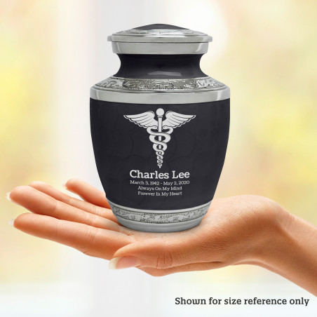 Select Caduceus Sharing Urn - Ebony Black to create a personal memorial that is a step larger than a keepsake urn but more petite than a full size urn. Bold, attractive colors offer sharp contrast with the engraved text and detailed artwork.