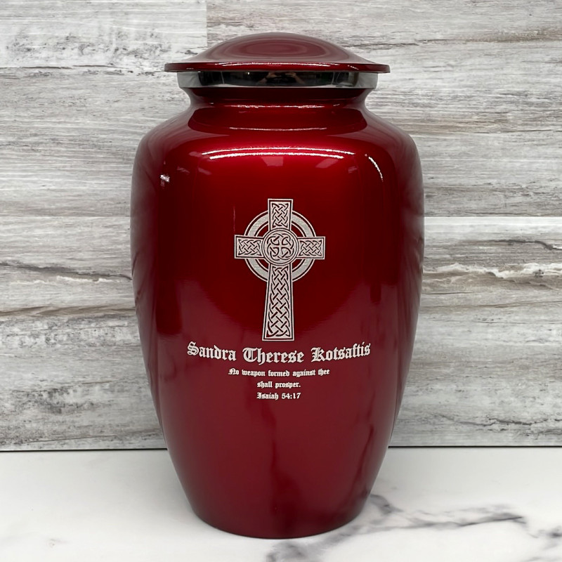 The beautiful color of our Ruby Red Cremation Urn enhances the contrast of the elegantly engraved Celtic Cross exclusively found at Green Meadow Memorials.