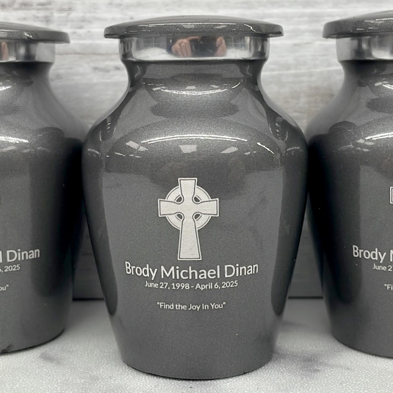 Choose the Gunmetal Celtic Cross Keepsake Cremation Urn to create a personal memorial for a loved one with artwork dedicated to faith. Customize the urn with special engraving for each family member or close friend, creating memorials for each to hold close.