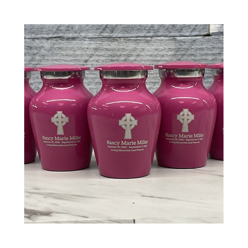 Choose a Celtic Cross Keepsake Urn to create an intimate and personal memorial for family members or close friends. Bold, attractive colors offer sharp contrast with the engraved text and artwork.