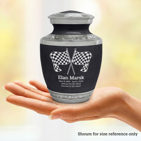 Select Checkered Flags Sharing Urn - Ebony Black to create a personal memorial that is a step larger than a keepsake urn but more petite than a full size urn. Bold, attractive colors offer sharp contrast with the engraved text and detailed artwork.