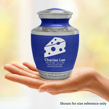 Select Cheese Wedge Sharing Urn - Royal Blue to create a personal memorial that is a step larger than a keepsake urn but more petite than a full size urn. Bold, attractive colors offer sharp contrast with the engraved text and detailed artwork.