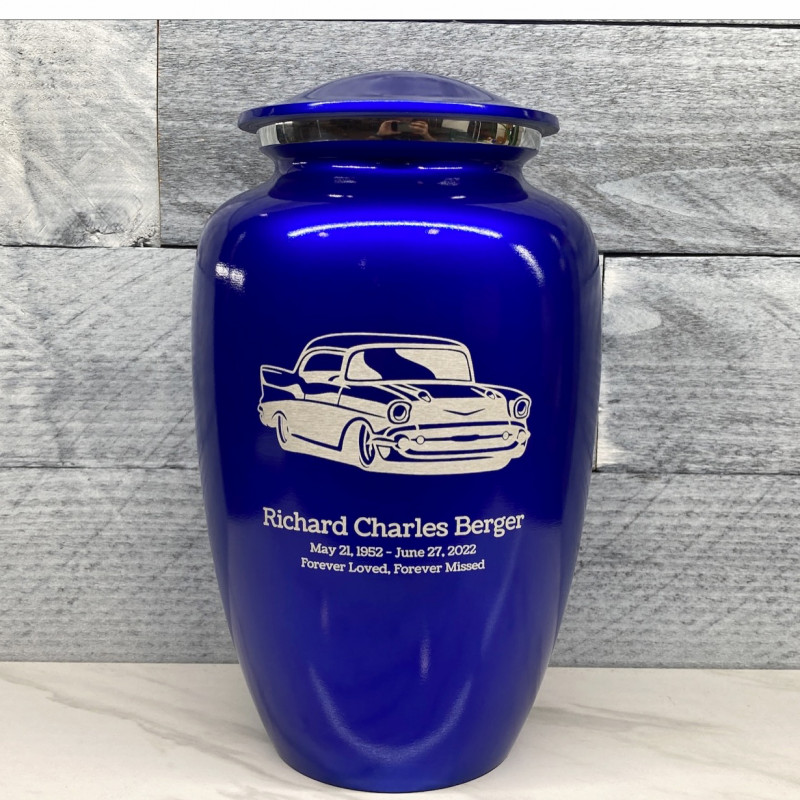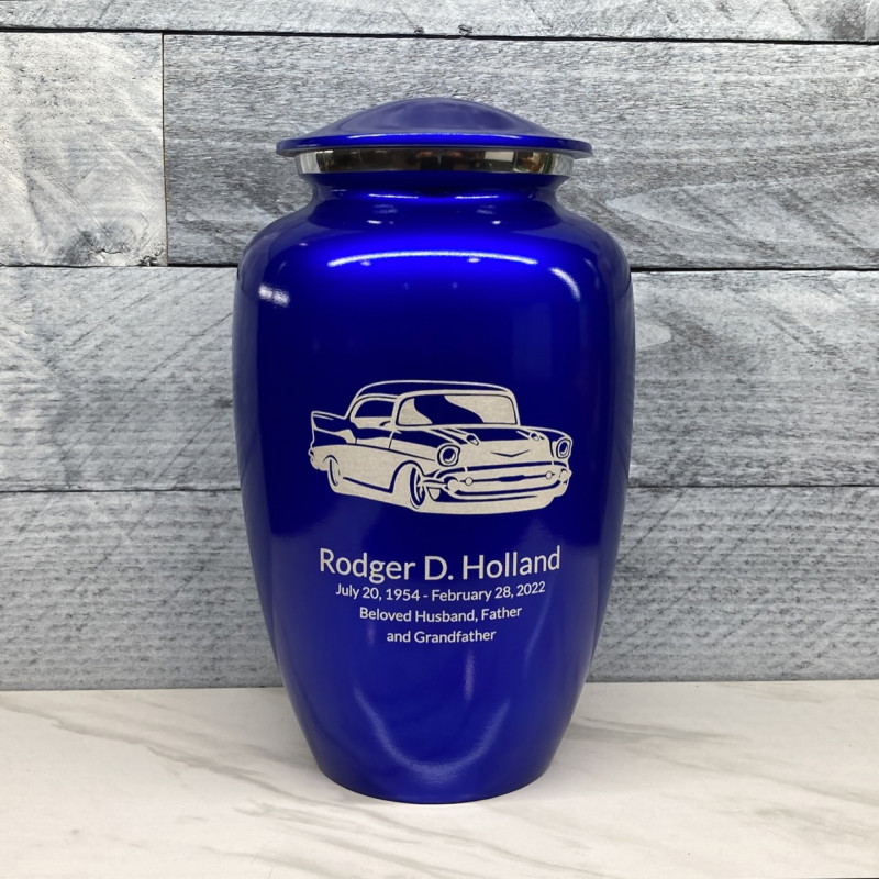 The Midnight Blue Classic Car Cremation Urn is a handsome way to memorialize a loved one who was a fan of vintage cars.  Inspired by 1950's classics, this classic car urn recalls the good old days, car shows and always having one more thing to work on.  Optional additional text engraving on the front and back allow for a custom urn crafted to last for generations.