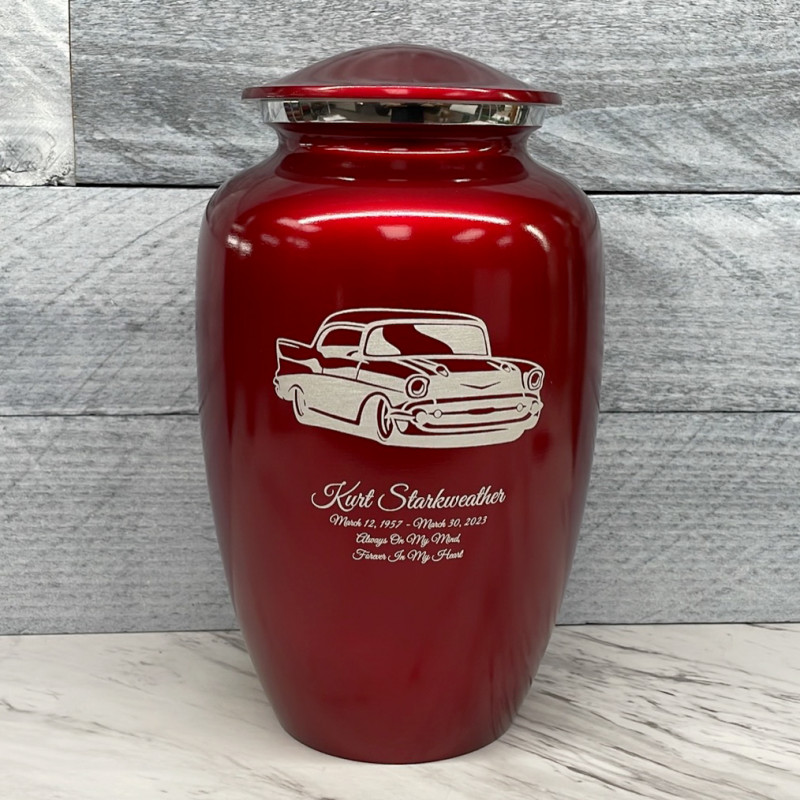 The Ruby Red Classic Car Urn memorializes your loved one with a detailed street cruiser engraving engraved into a beautiful red urn. The classic car artwork along with optional engraving that includes a name line, date line and three lines for sentiments allows for the creation of completely custom memorial crafter to stand the test of time. The ruby red color was inspired by some of our favorite cars and makes a fitting color for a fellow enthusiast.