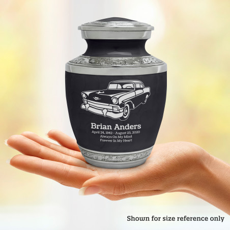 Select Classic Car II Sharing Urn - Ebony Black to create a personal memorial that is a step larger than a keepsake urn but more petite than a full size urn. Bold, attractive colors offer sharp contrast with the engraved text and detailed artwork.