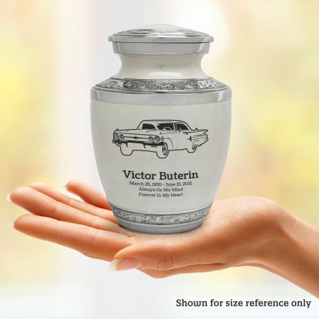 Select Classic Car III Sharing Urn - Radiant White to create a personal memorial that is a step larger than a keepsake urn but more petite than a full size urn. Bold, attractive colors offer sharp contrast with the engraved text and detailed artwork.