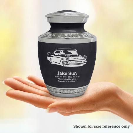 Select Classic Car Sharing Urn - Ebony Black to create a personal memorial that is a step larger than a keepsake urn but more petite than a full size urn. Bold, attractive colors offer sharp contrast with the engraved text and detailed artwork.
