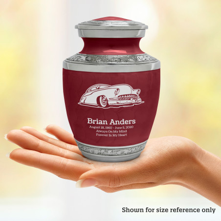 Select Classic Car VII Sharing Urn - Rose Red to create a personal memorial that is a step larger than a keepsake urn but more petite than a full size urn. Bold, attractive colors offer sharp contrast with the engraved text and detailed artwork.