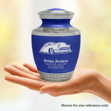 Select Classic Car VII Sharing Urn - Royal Blue to create a personal memorial that is a step larger than a keepsake urn but more petite than a full size urn. Bold, attractive colors offer sharp contrast with the engraved text and detailed artwork.