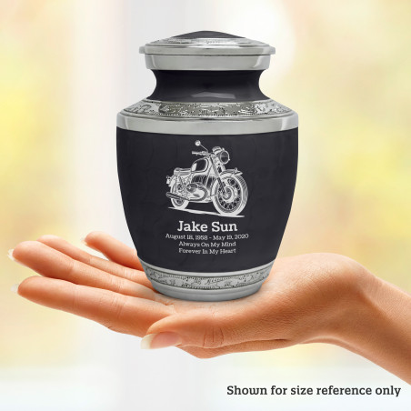 Select Classic Motorcycle Sharing Urn - Ebony Black to create a personal memorial that is a step larger than a keepsake urn but more petite than a full size urn. Bold, attractive colors offer sharp contrast with the engraved text and detailed artwork.