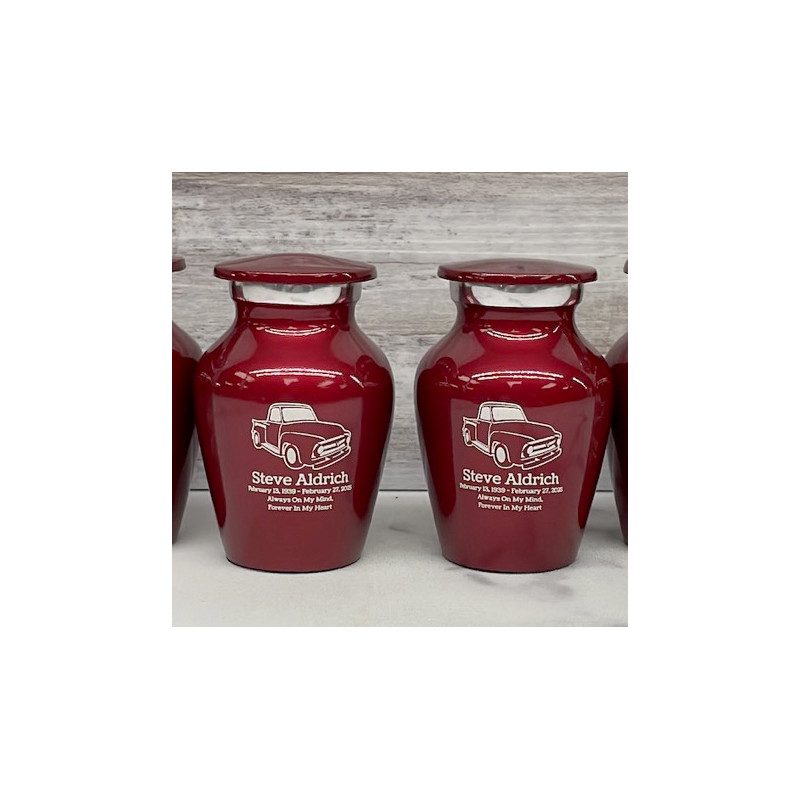 Choose a Classic Stepside Truck Keepsake Urn to create an intimate and personal memorial for family members or close friends. Bold, attractive colors offer sharp contrast with the engraved text and artwork.