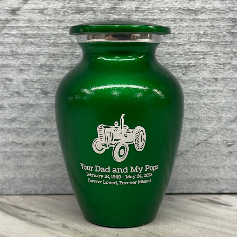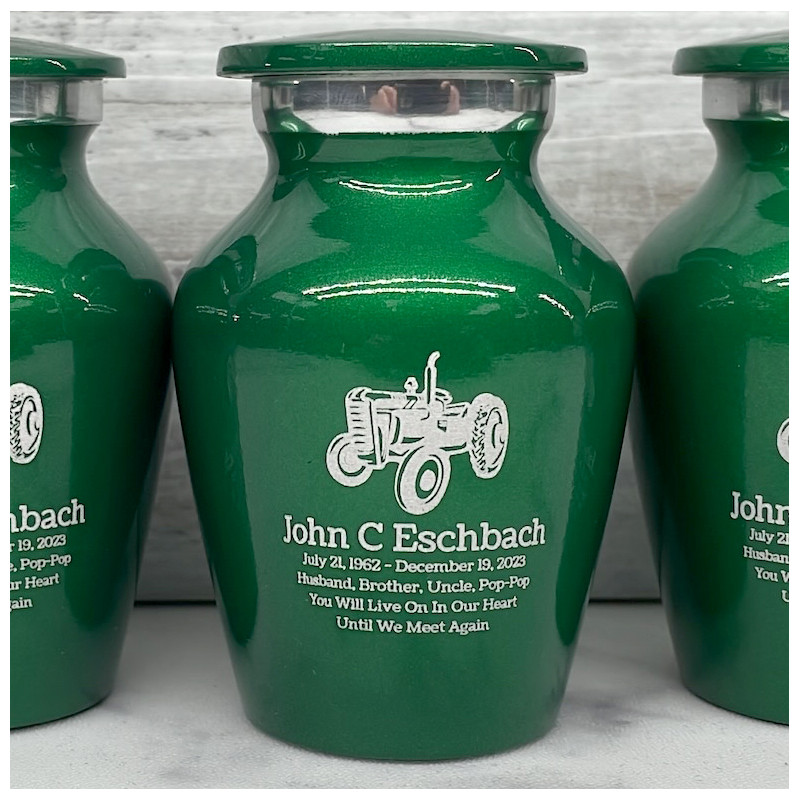 My grandpa always was a John Deere farmer. At his service, we each took home a small John Deere tractor from his collection. My mom had also ordered these keepsakes and they were all just so perfect. His toy tractor and this urn are now together in my office where I can see them and remember him always.