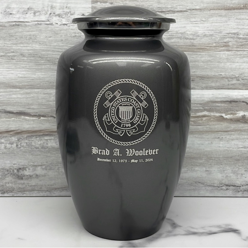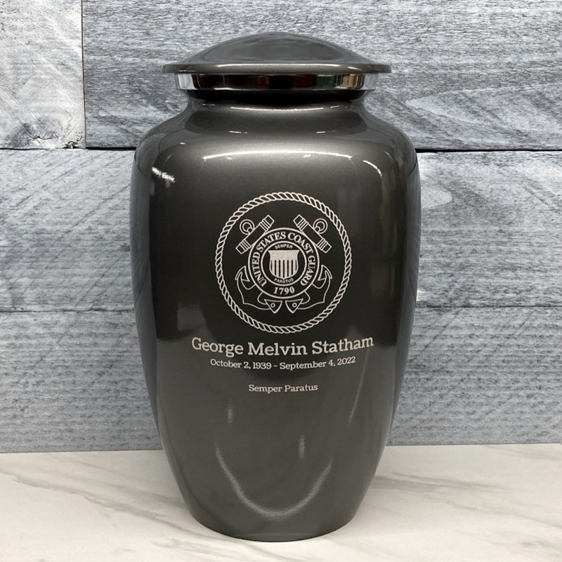 The Gunmetal Gray Coast Guard Cremation Urn is a handsome way to memorialize your beloved and dedicated veteran. Available custom engraving on the front and back of the urn allows for the creation of a truly unique memorial.